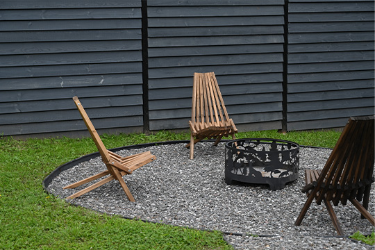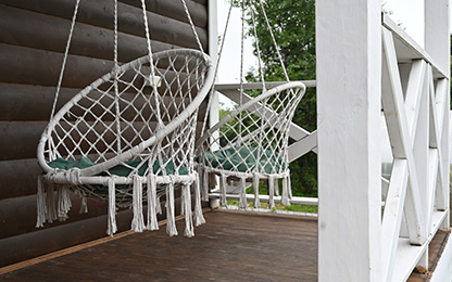 На террасе у домика расположена чан, зона мангала и садовая мебель.