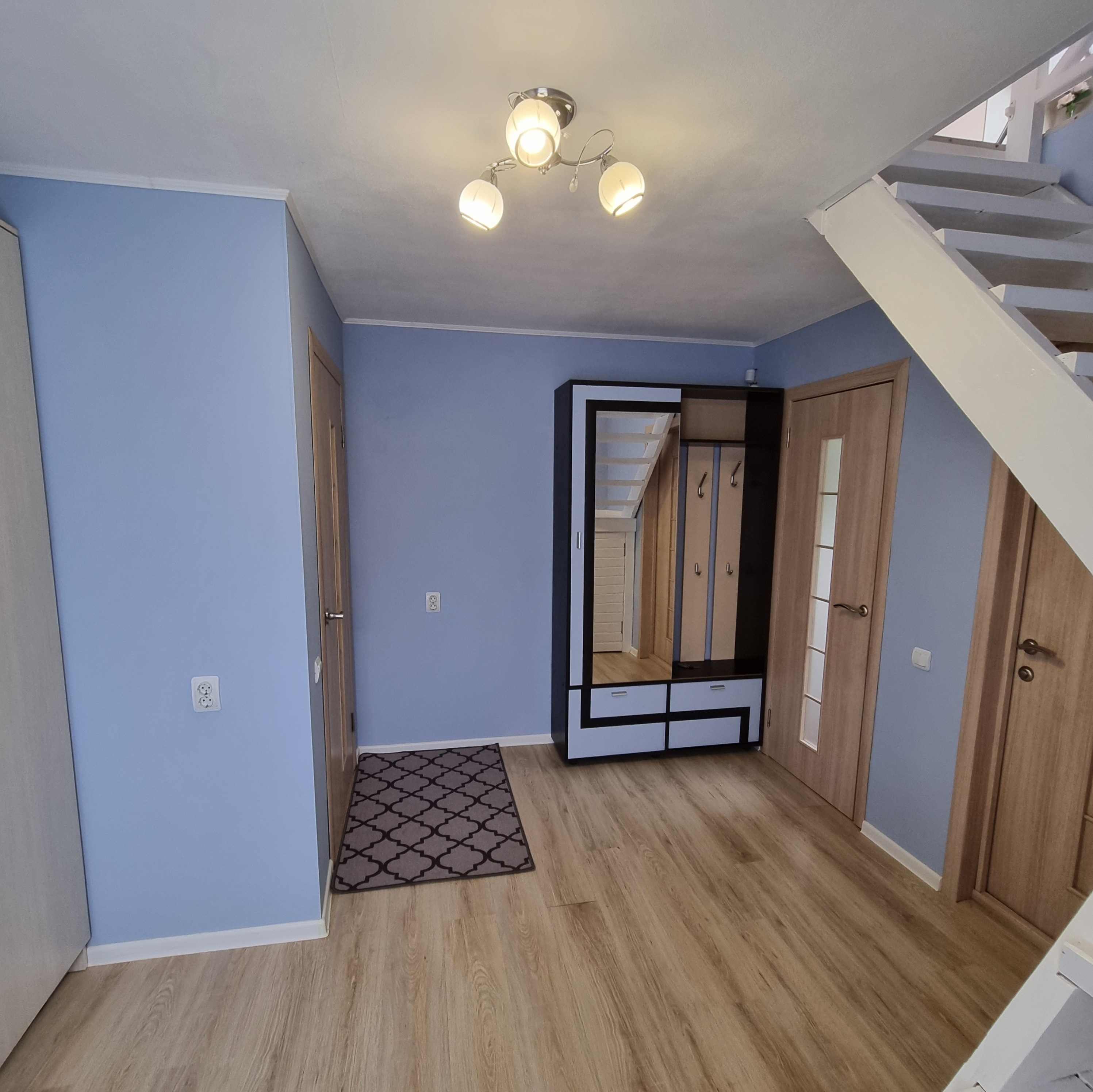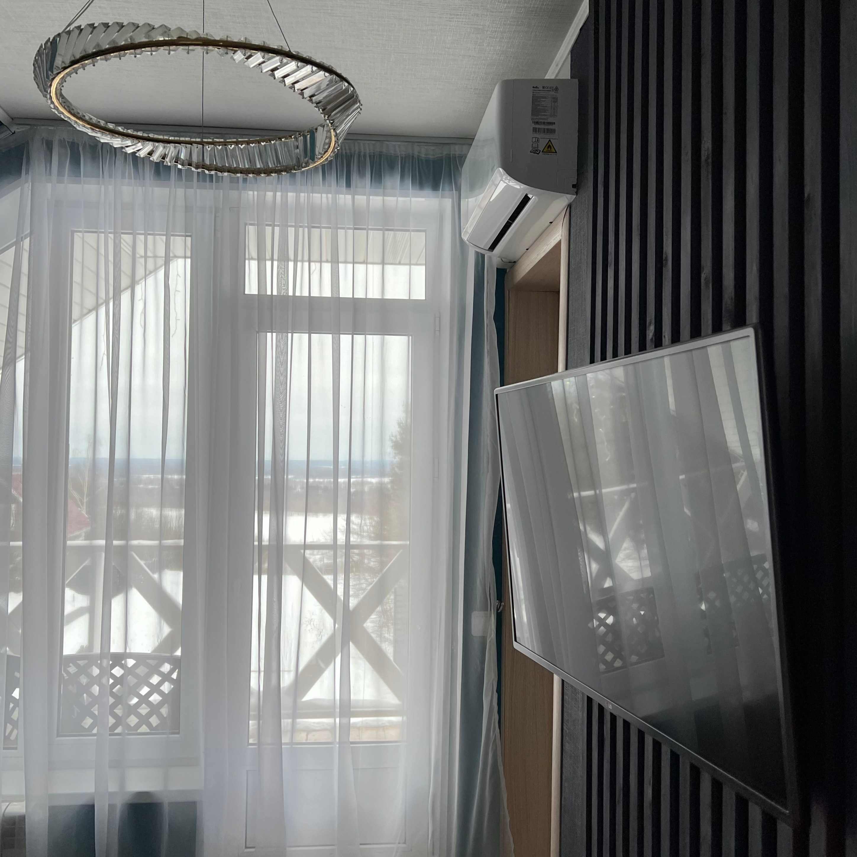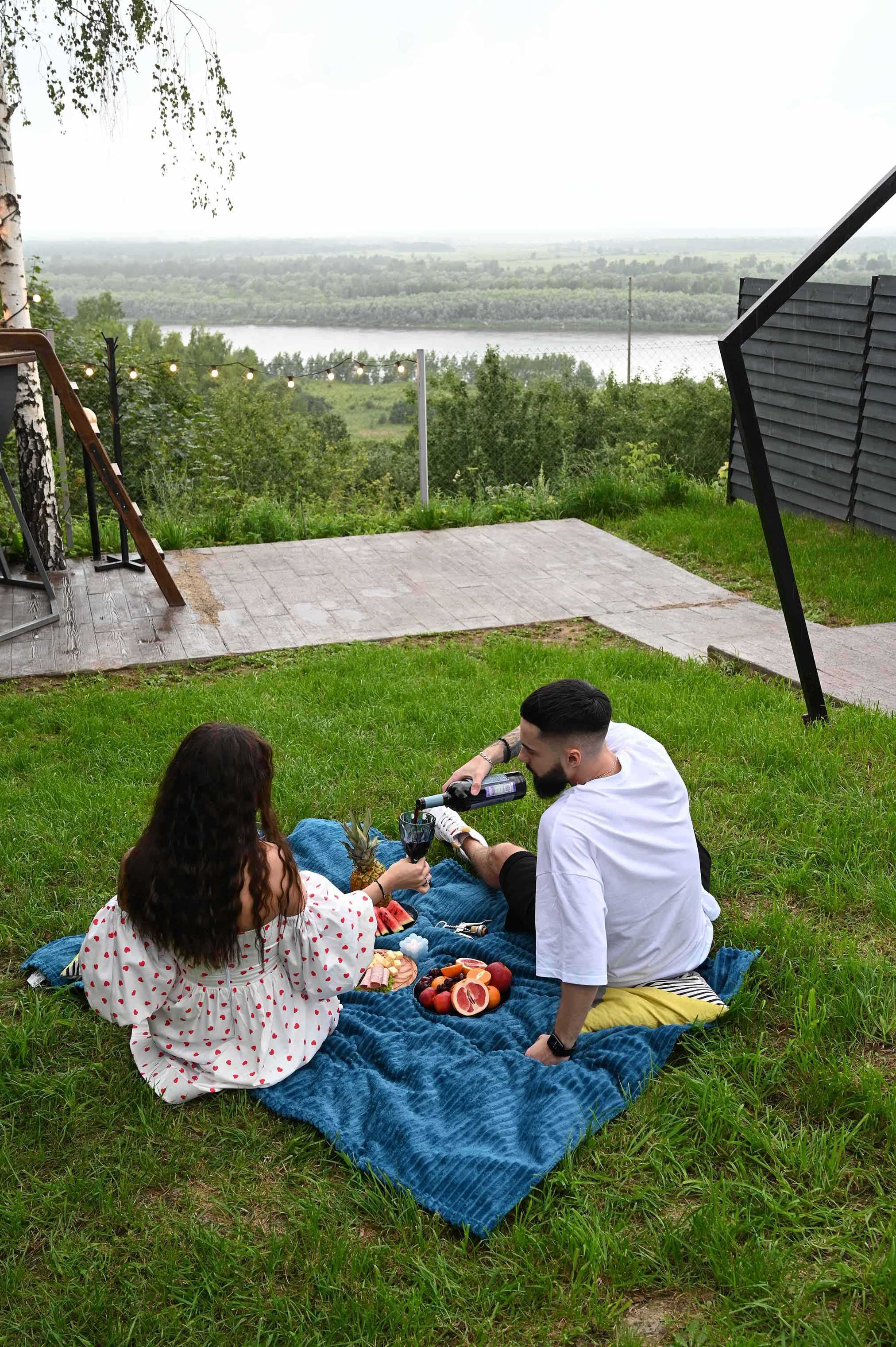 Двухэтажный домик 96м² со спальней и всеми удобствами. Оснащен террасой и панорамными окнами с видом на реку.