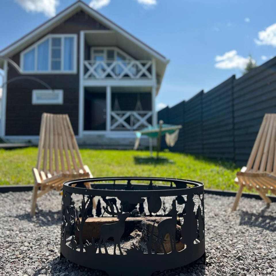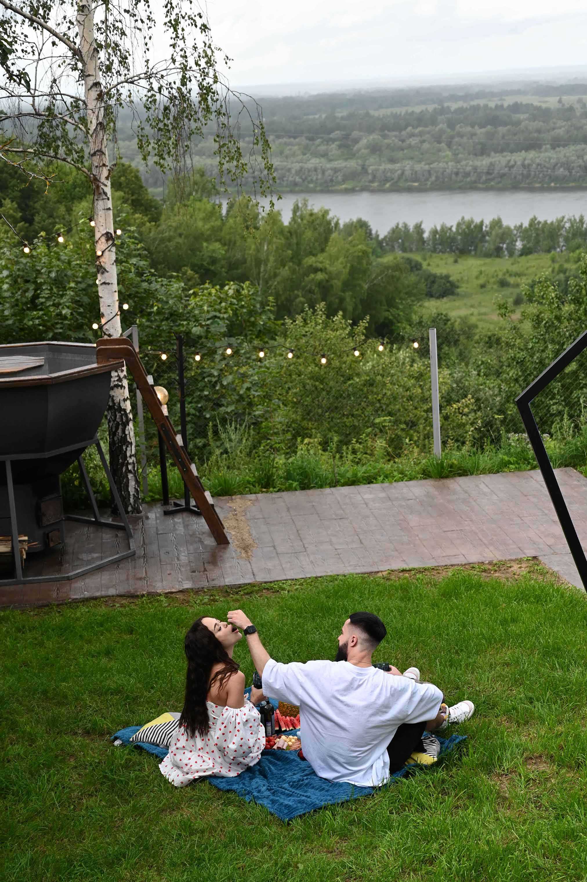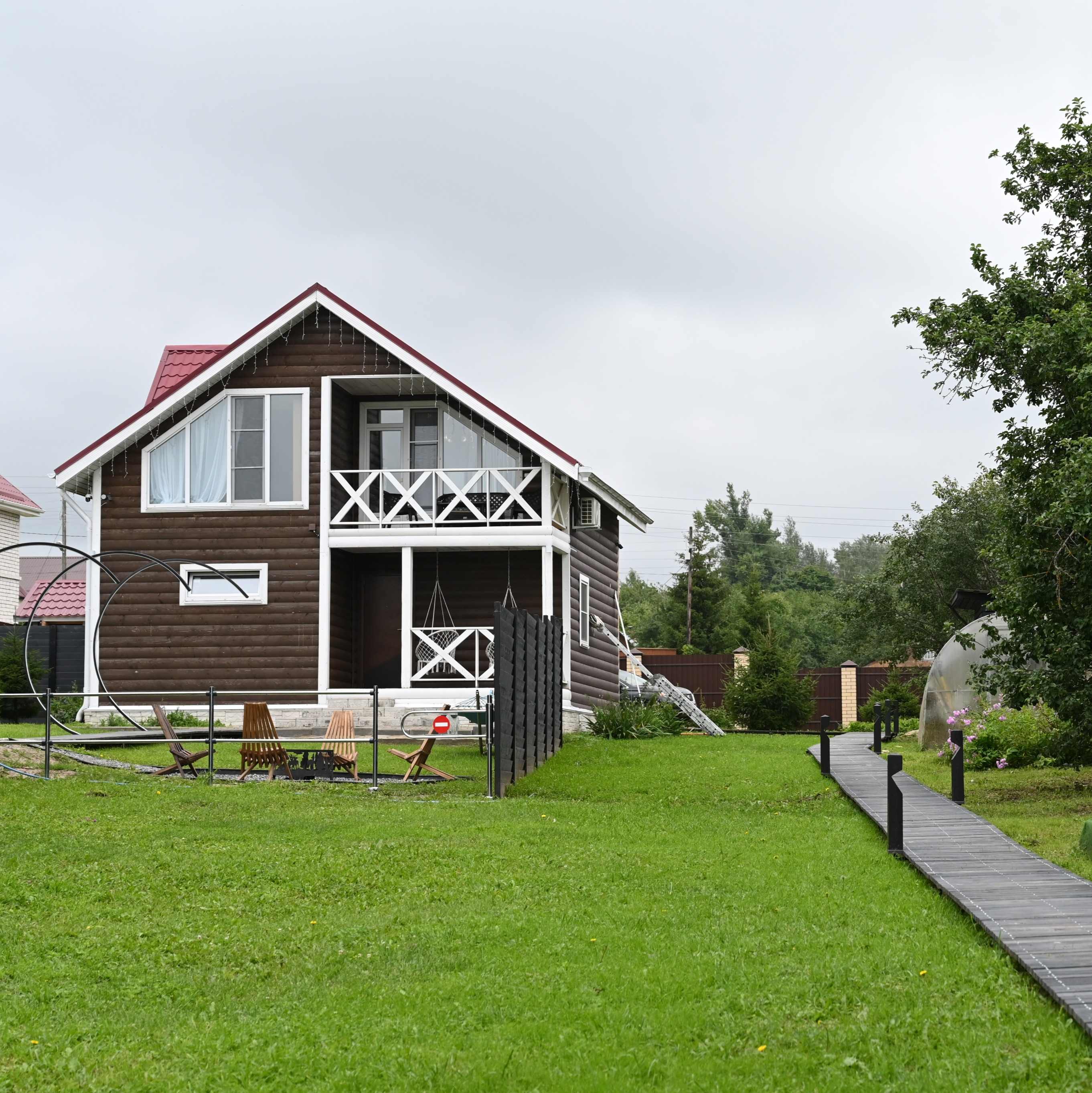 Двухэтажный домик 75 м² со спальней на 2 этаже и всеми удобствами. Оснащен террасой и панорамными окнами с видом на реку. На террасе у домика расположены гриль барбекю, мангал и садовая мебель.