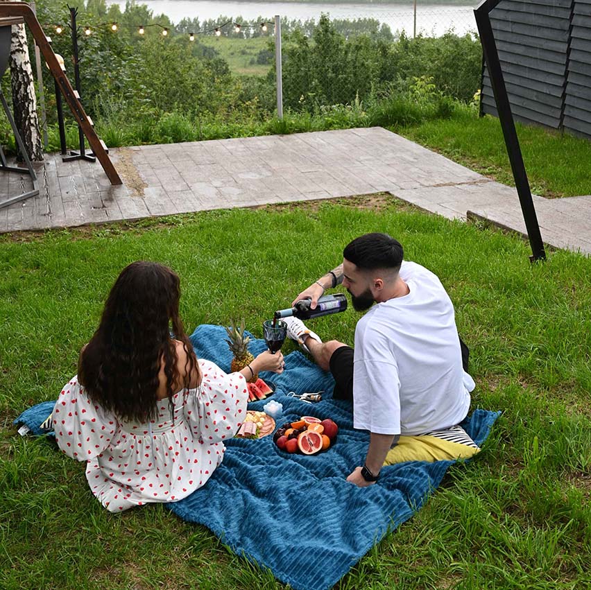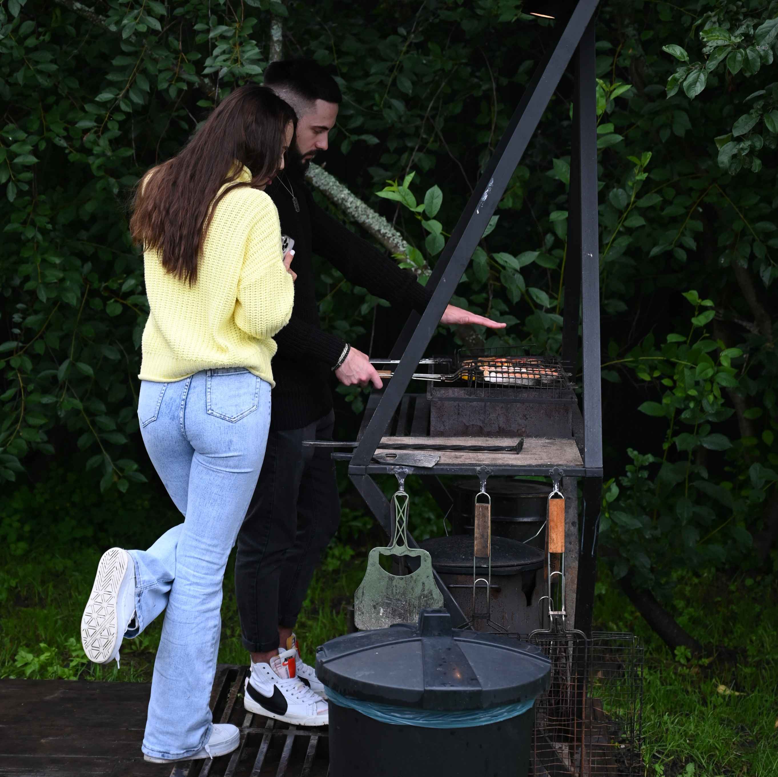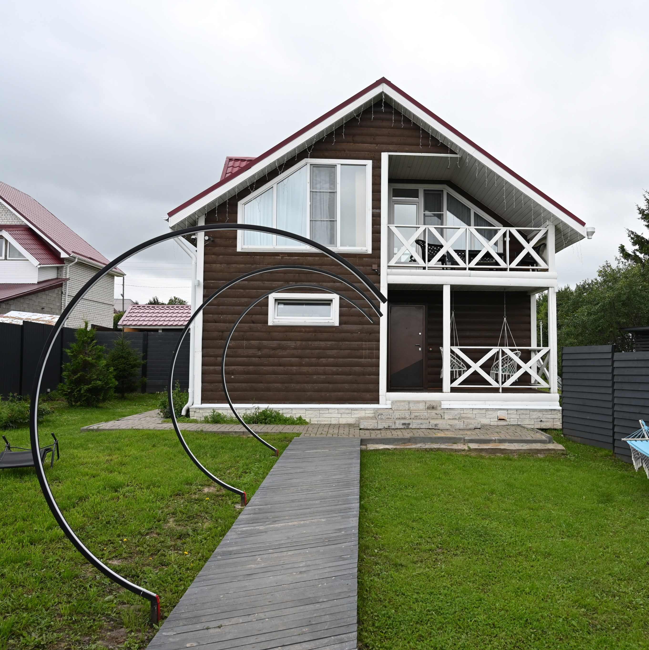 Двухэтажный домик 75 м² со спальней на 2 этаже и всеми удобствами. Оснащен террасой и панорамными окнами с видом на реку. На террасе у домика расположены гриль барбекю, мангал и садовая мебель.
