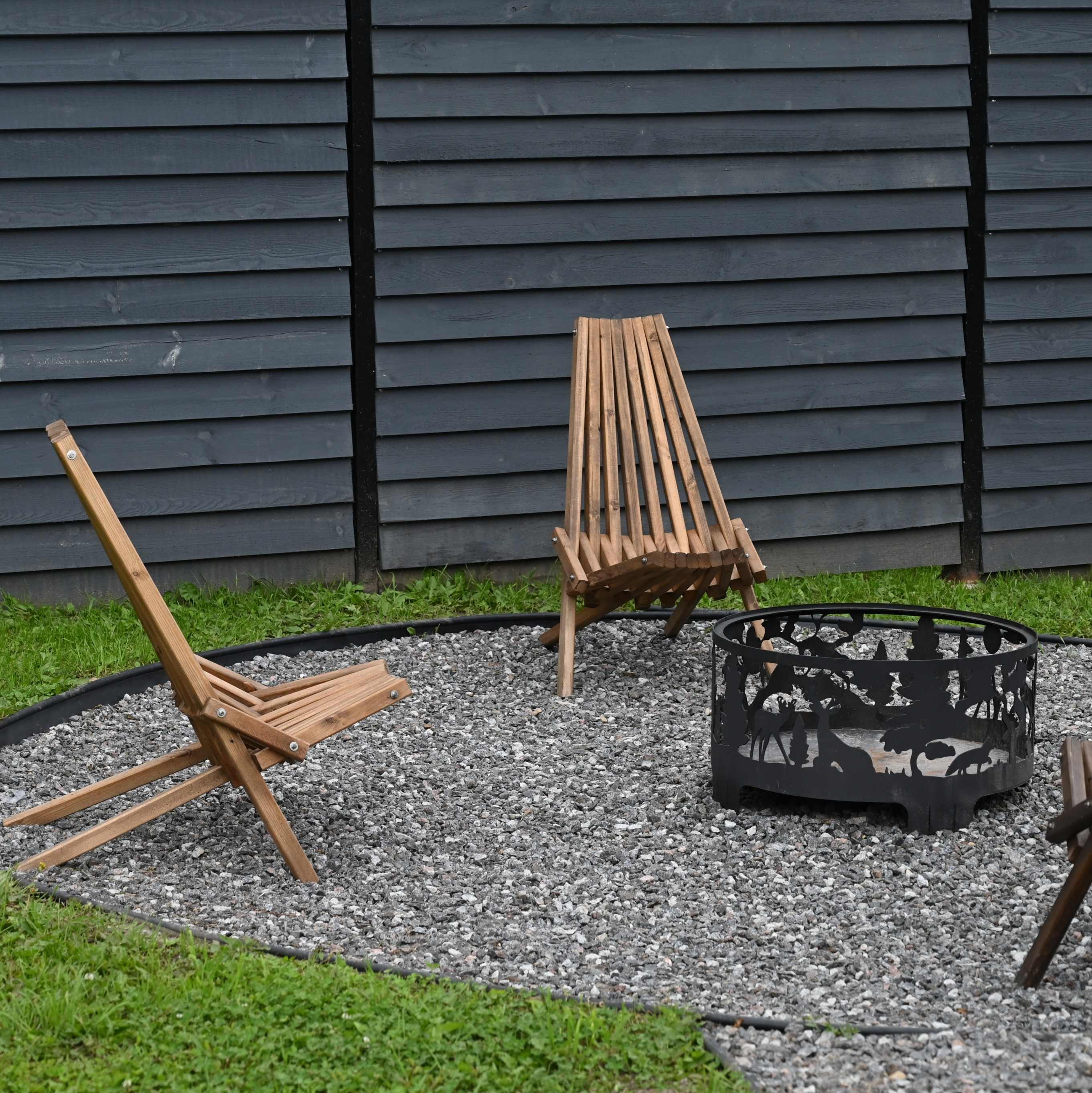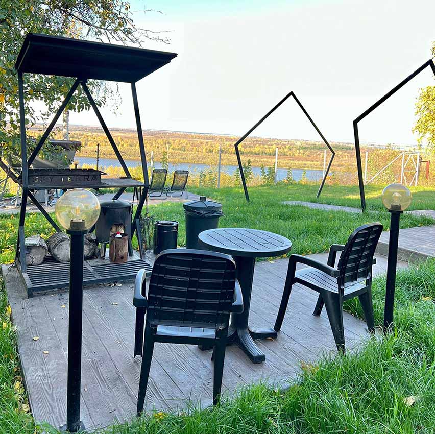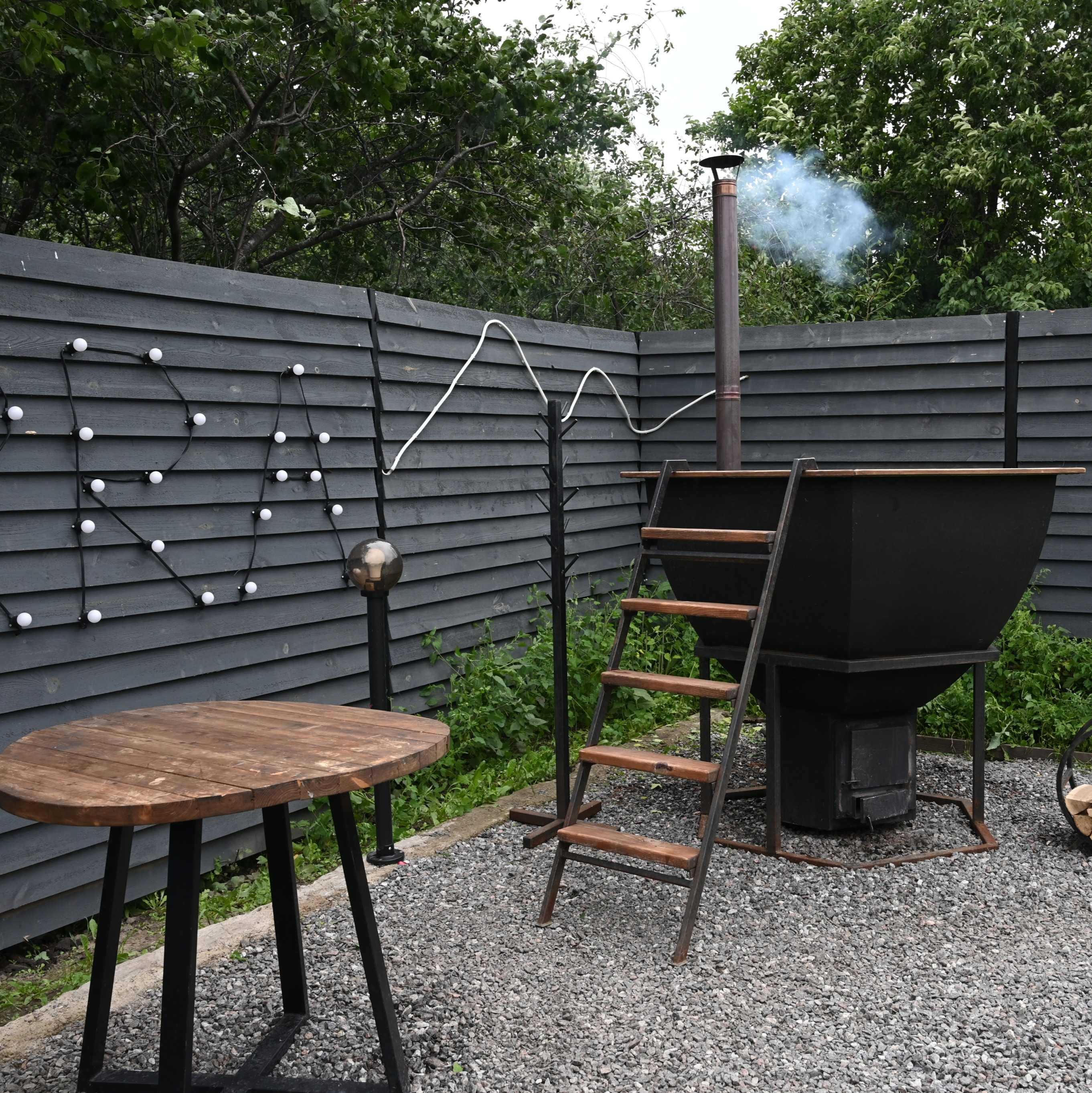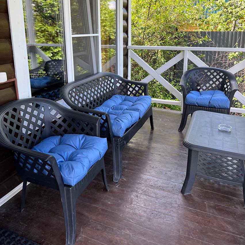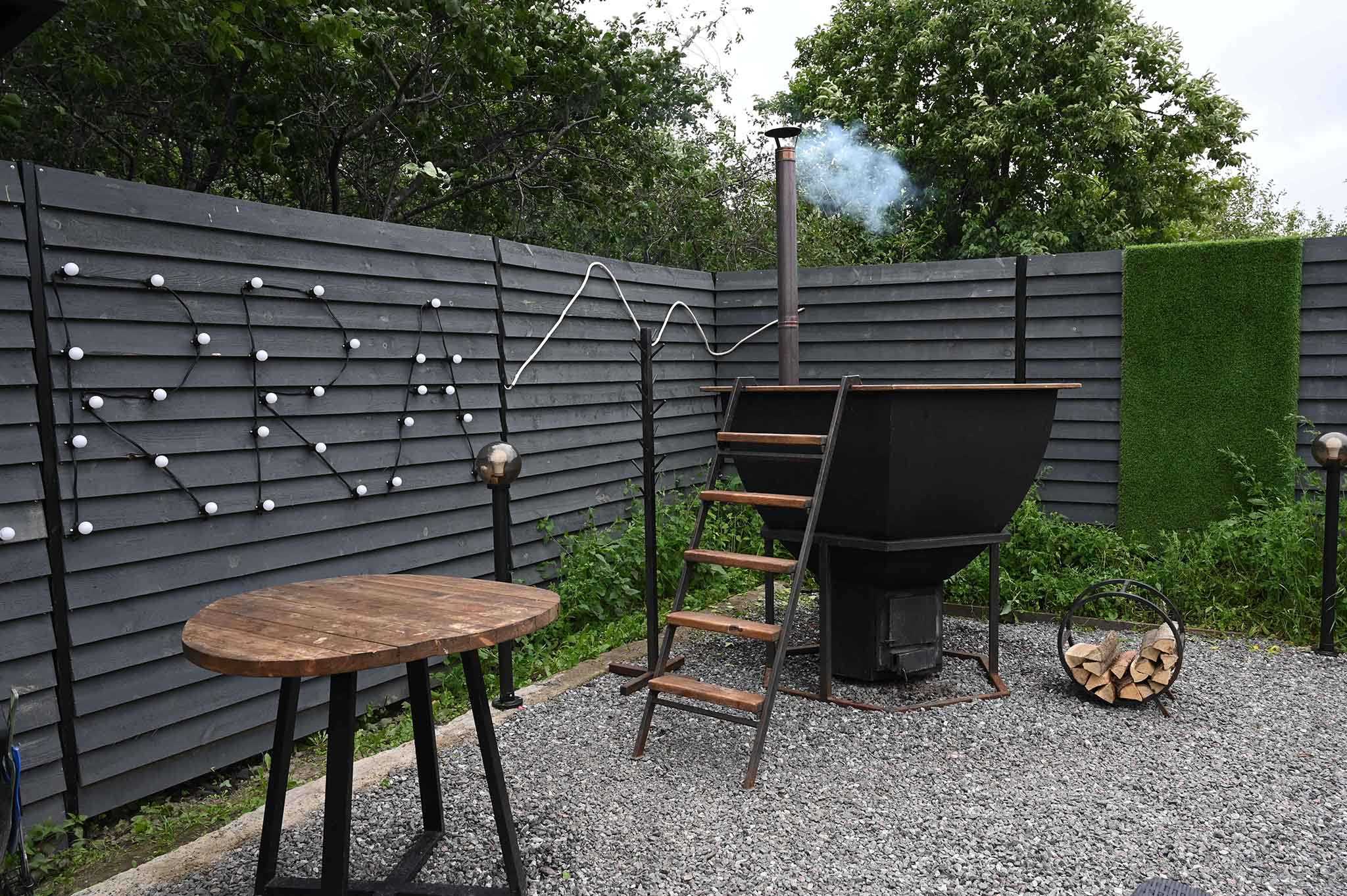 На террасе у домика расположена чан, зона мангала и садовая мебель.